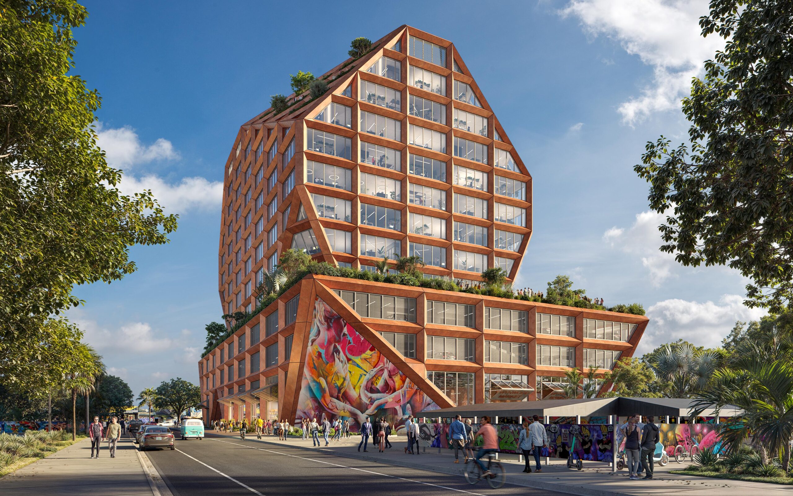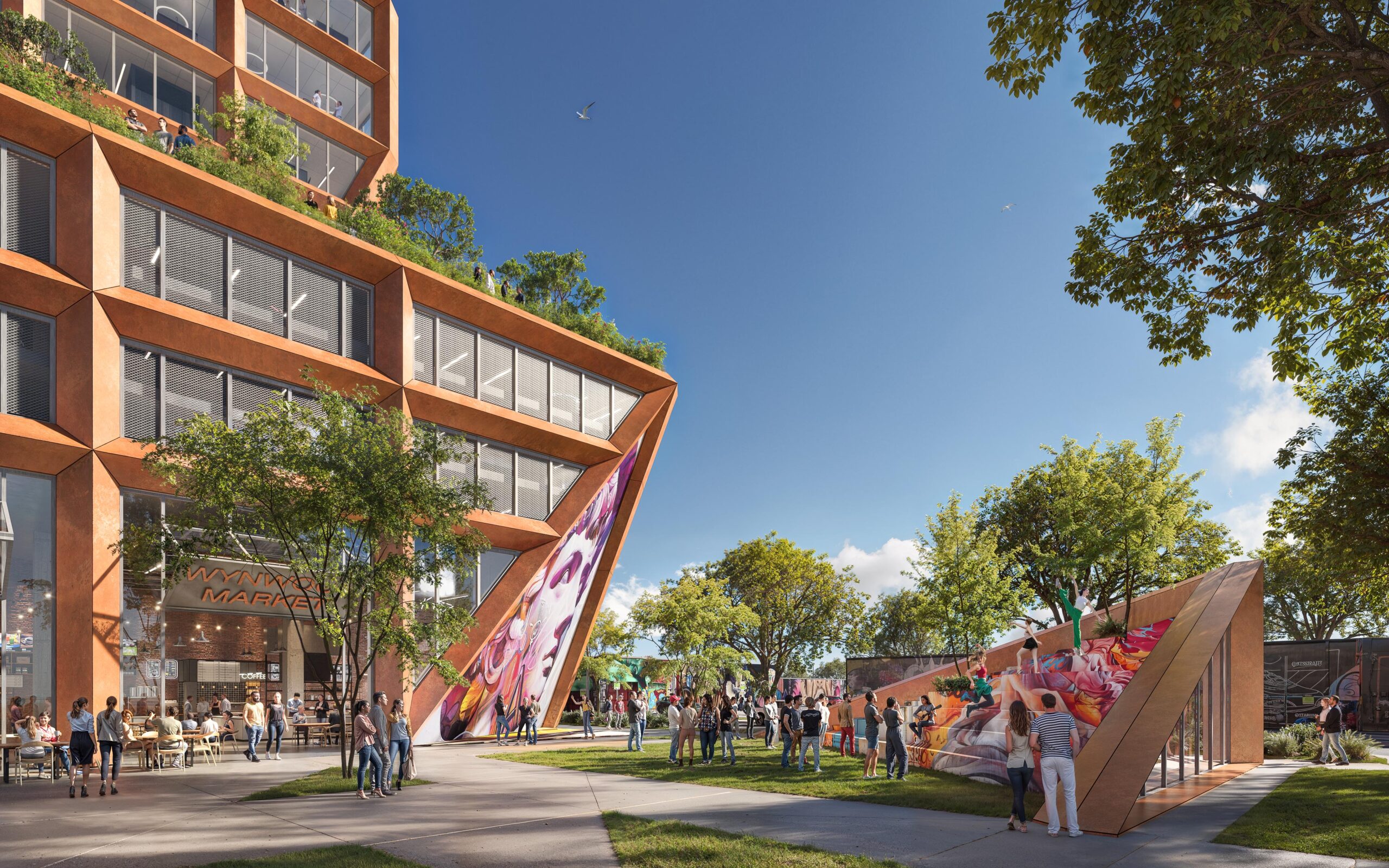 The ground floor of the Wynwood Incubator features 22,900 square feet of prime retail space, envisioned as a bustling hub with retail shops, cafes, and restaurants. This design element enhances the streetscape, allowing the retail and food spaces to blend into the lively Wynwood environment. The building’s strategic location offers easy access to a variety of amenities, including restaurants, entertainment venues, galleries, and iconic street art, making it an attractive destination for both tenants and visitors. The upper levels provide 272,000 square feet of leasable office space with open, efficient floor plates, catering to a range of business needs from startups to large enterprises. The top floors feature outdoor terraces, maximizing natural light and offering panoramic views of downtown Miami and the Mana Commons. These terraces, alongside a state-of-the-art fitness center, gourmet café, and vibrant lounge areas, enhance employee well-being and foster community engagement.
